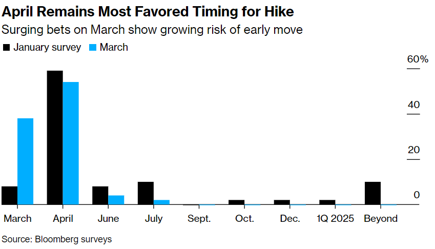 根据外媒的一项调查,尽管超过半数的日本央行观察者预计负利率政策将在四月份结束,但几乎所有人都认为加息有可能下周开始。