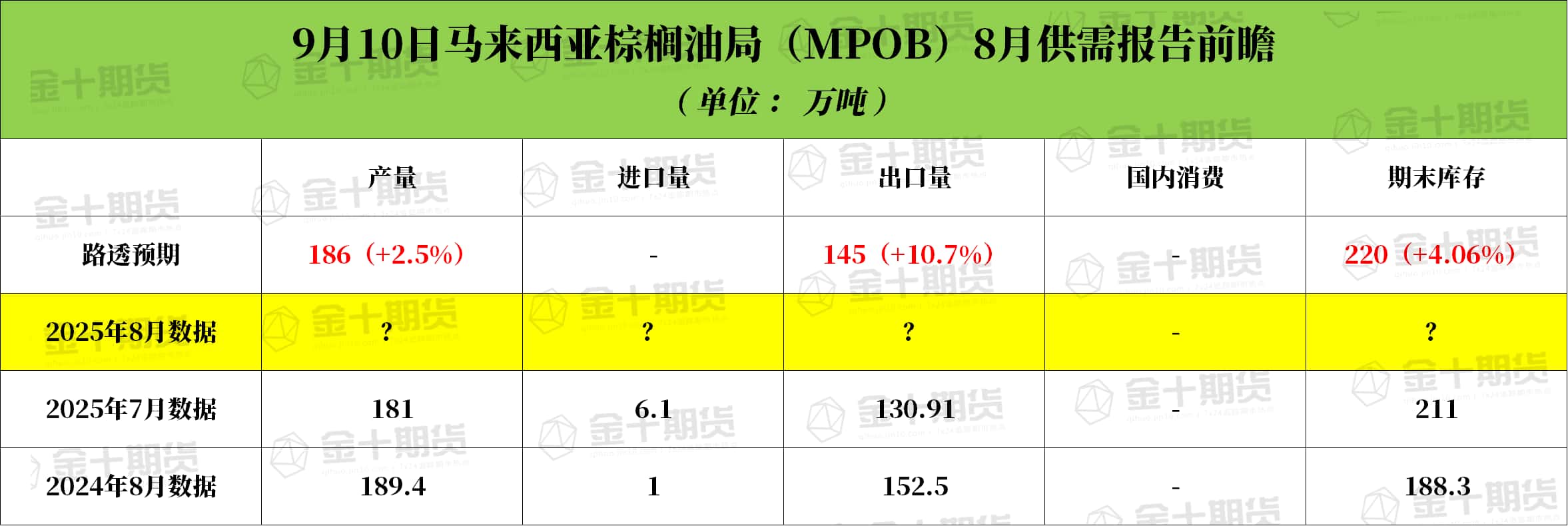马来西亚棕榈油局(MPOB)将于北京时间9月10日(周三)中午12:30发布8月份马棕油供需数据。