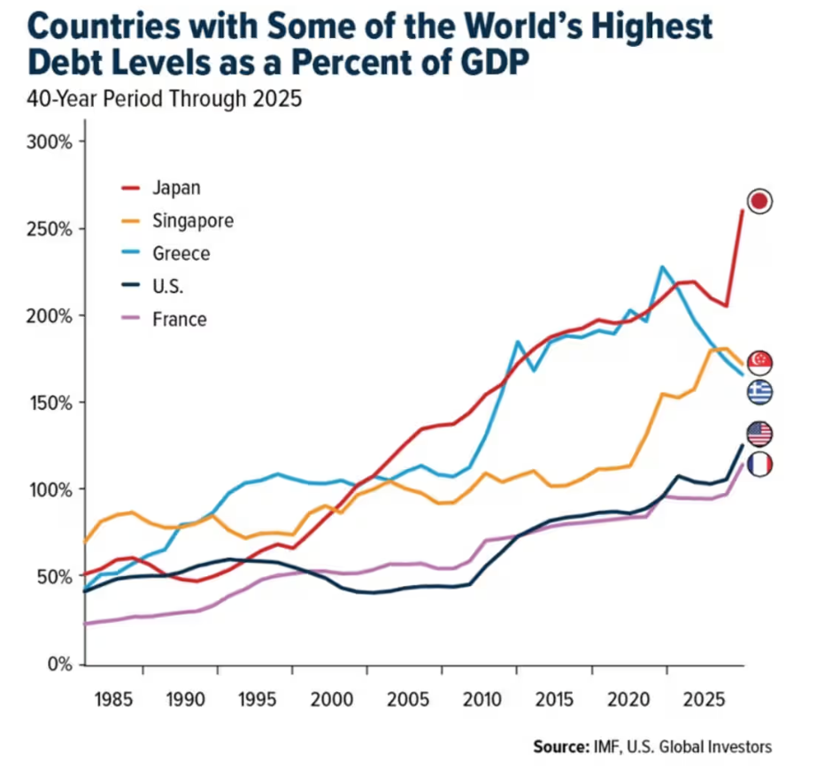 美国全球投资公司首席执行官兼首席投资官弗兰克·霍姆斯(Frank Holmes)表示:“美国政府债务高达令人瞠目结舌的37.5万亿美元,约占国内生产总值(GDP)的124%。”他指出,1971年时任美国总统理查德·尼克松(Richard Nixon)治下美元与黄金脱钩时,美国债务约为4000亿美元,不足GDP的40%。