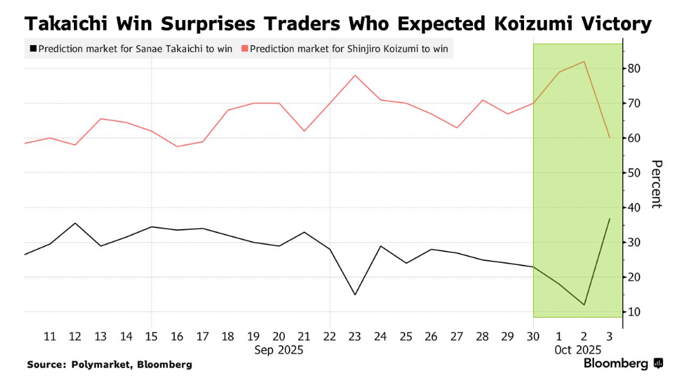 在上周六赢得自民党领袖选举后,高市早苗有望成为日本首位女首相。投资者此前曾预计这一职位将由政治世家子弟小泉进次郎(Shinjiro Koizumi)担任,外界认为小泉进次郎在财政方面更为谨慎,并会让日本央行推进政策正常化。