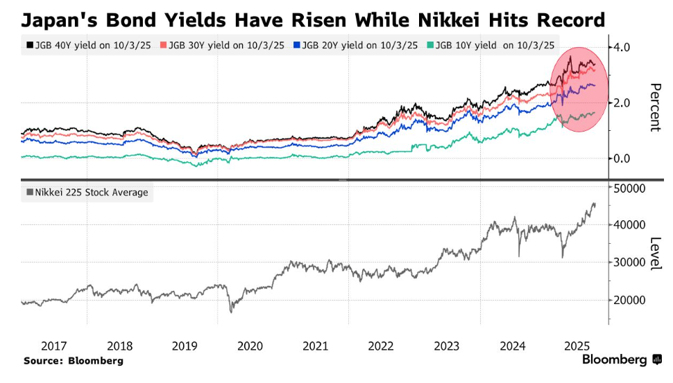 再加上对日本央行加息的猜测,日本10年期国债收益率近日徘徊在2008年以来的最高水平附近。这推动日元兑美元汇率在过去一周走强,同时在全球科技股上涨的推动下,日经225指数刷新历史高点。