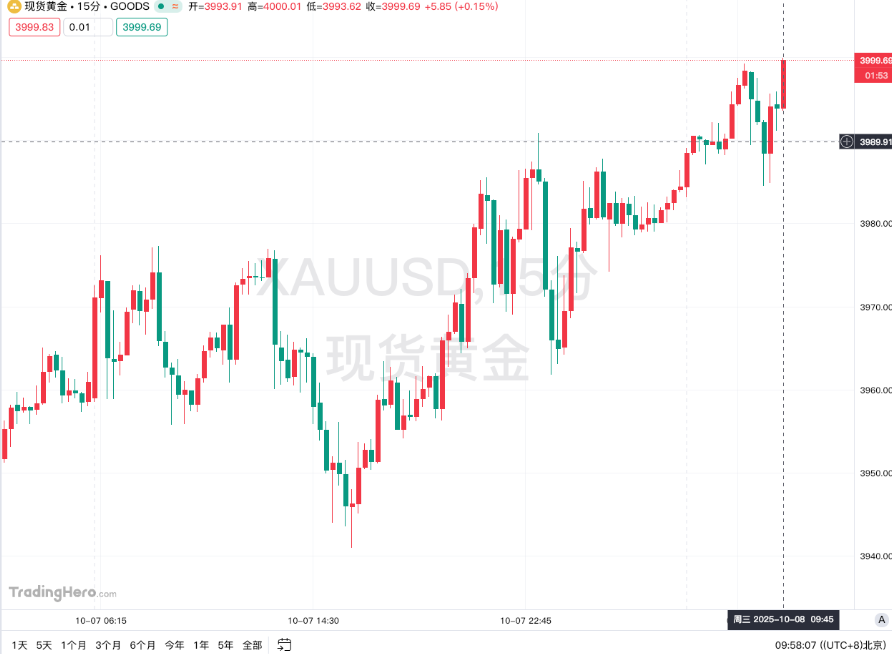 北京时间周三上午9:57左右,黄金市场再度见证历史时刻,现货黄金站上4000美元整数关口,再创历史新高,今年迄今已累涨近1400美元。