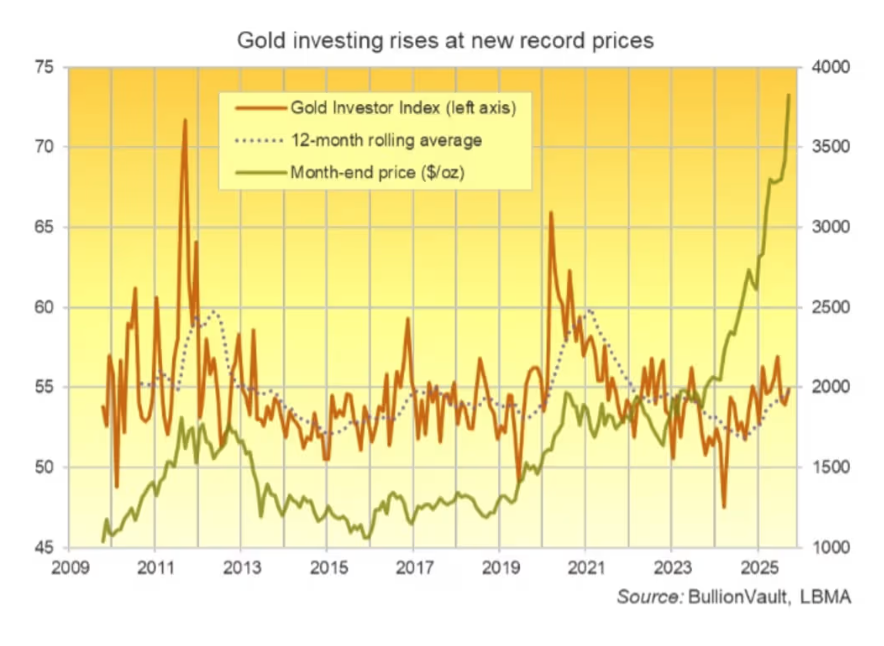 BullionVault在9月发布报告称,其黄金投资者指数(该指数通过实际交易行为衡量私人投资者情绪)上升至54.9,为6月以来的最高水平。若黄金买卖双方完全平衡,该指数将为50。