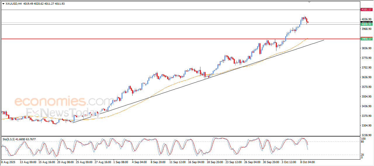 Economies.com的分析师今日最新观点:现货黄金价格在上一交易日盘中出现回调下跌,此次调整旨在对前期强劲涨势后的获利进行修正。与此同时,金价正试图积聚所需的动能,以实现反弹和再次上涨。值得注意的是,随着价格触及超买水平,相关强弱指标上已出现负面信号,显示市场正试图消化当前的超买状态。