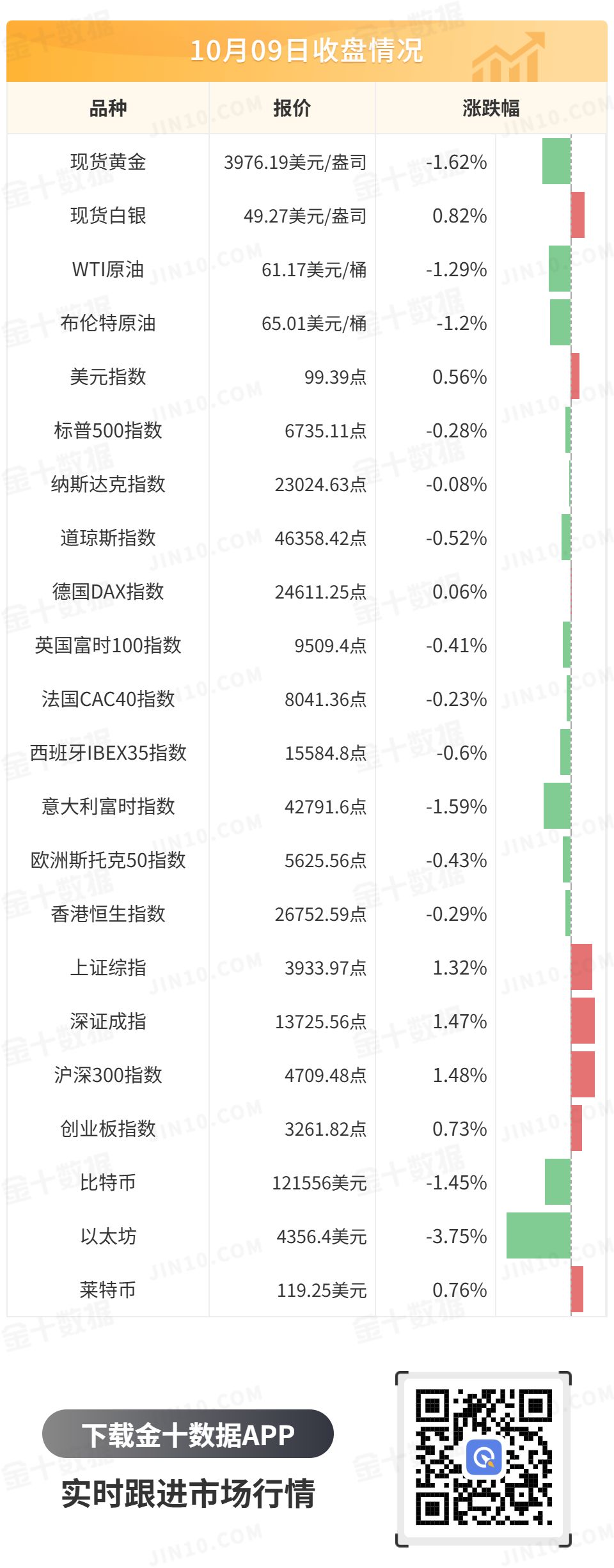 由于美元走高,且以色列和哈马斯达成停火协议后黄金投资者获利了结,现货黄金一度较历史高位跌超100美元,最终收跌1.62%,收报3976.19美元/盎司;现货白银坐上过山车,最高触及51.223美元/盎司,再创14年新高,美盘大幅下挫,抹去日内大部分涨幅,最终收涨0.82%,报49.27美元/盎司。