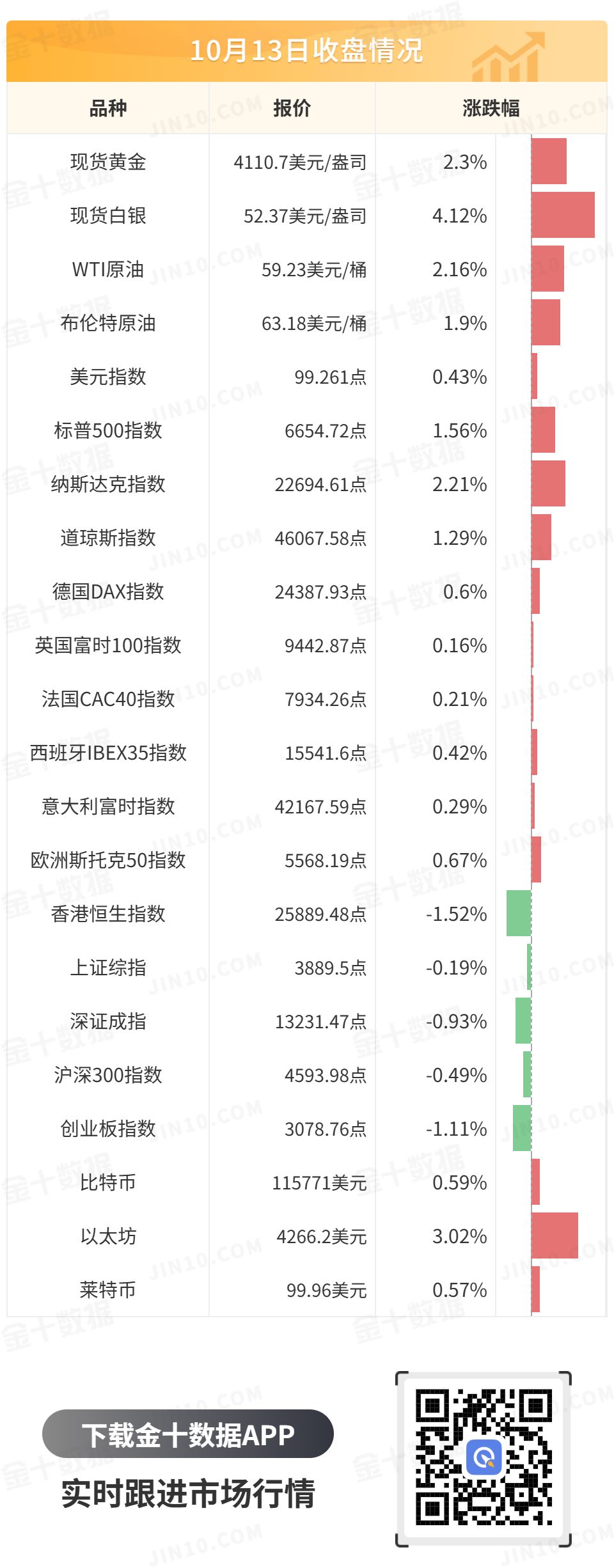 受贸易局势不确定性和美联储降息预期升温的影响,现货黄金暴涨100美元,突破4100美元/盎司关口,再创历史新高,最终收涨2.3%,收报4110.7美元/盎司;在伦敦市场历史性空头挤压的推动下,现货白银突破52美元/盎司,再创历史纪录新高,最终收涨4.12%,报52.37美元/盎司。