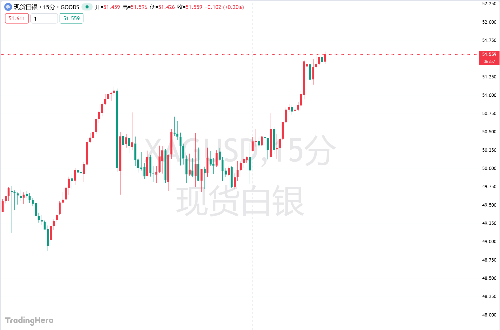 周一,由于伦敦白银市场出现流动性危机,且在黄金延续创纪录涨势的带动下,国际现货白银日内涨幅扩大至3%,当前徘徊在51.5美元/盎司附近,再创历史新高,今年以来累计涨幅已超过78%。