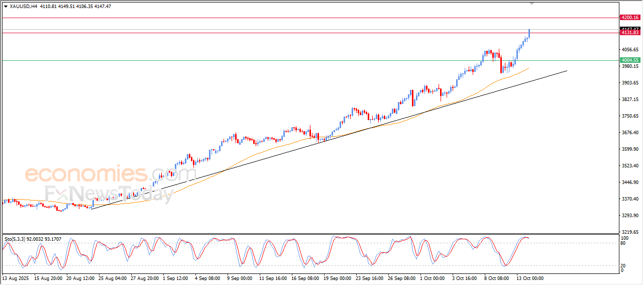 Economies.com的分析师今日最新观点:现货黄金价格盘中持续上涨,每一轮多头行情均创下历史新高,最终突破了4130美元阻力位,这正是我们在此前分析中所预期的目标。这一上涨得到了其继续高于EMA50的交易的支撑,加强了短期主要看涨趋势的强度。