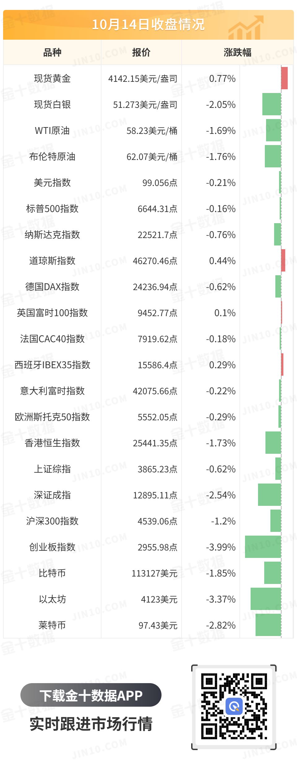现货黄金盘中触及4180美元/盎司关口,再创历史新高,随后出现闪崩,较日高回调近90美元,美盘重新走高,最终收涨0.77%,收报4142.15美元/盎司,为连续第三个交易日上涨;现货白银同样坐上过山车,盘中续刷历史新高后跳水,最终收跌2.05%,报51.273美元/盎司。