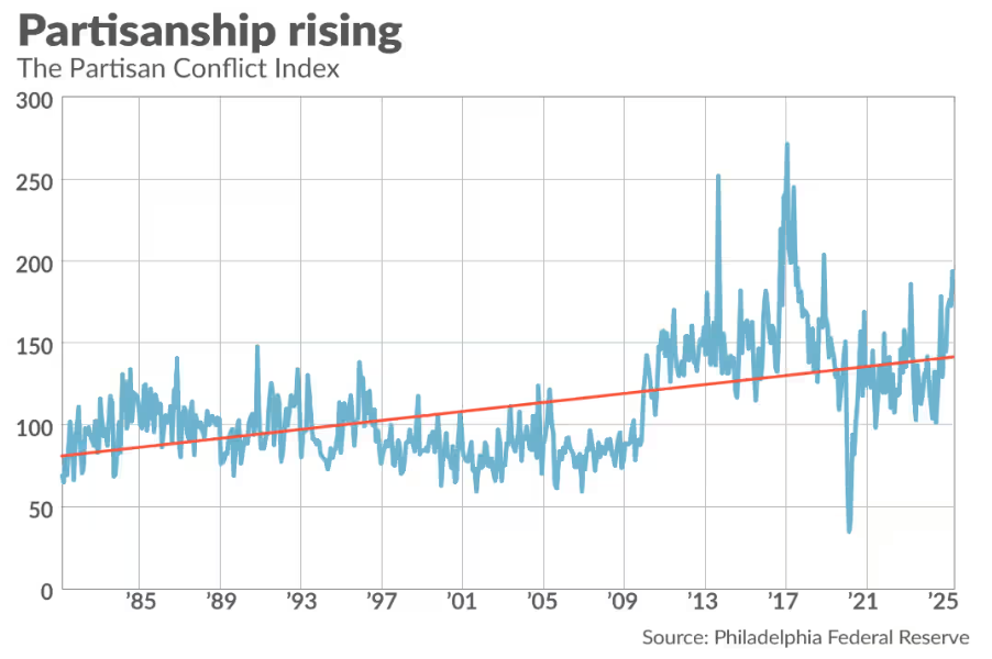 政府停摆闹剧标志着美国政治极化加剧。里士满联储经济学家的研究显示,政治极化会抑制企业投资,影响长期经济增长。
