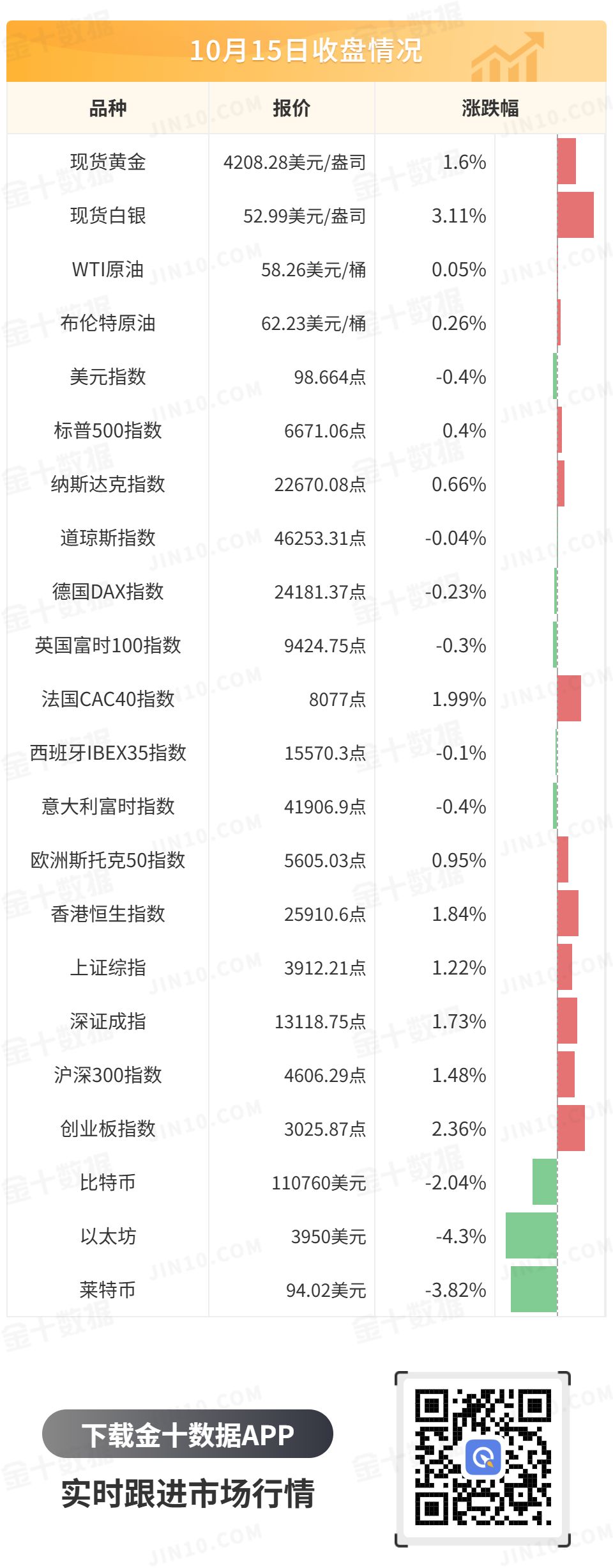 在美联储降息预期和地缘政治紧张局势的推动下,现货黄金延续创纪录涨势,突破4200美元,续创新高,最终收涨1.6%,收报4208.28美元/盎司,本周累涨近200美元;现货白银强势反弹,重新逼近历史高位,最终收涨3.11%,报52.99美元/盎司。