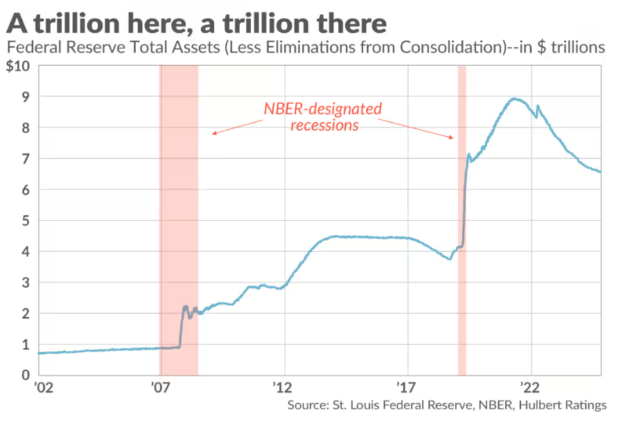当然,美联储的决定意义重大,该央行一直在从金融体系中抽走大量流动性。由于部分流动性原本可能会流入股市,因此量化紧缩想必一直是股市的重大阻力:自2022年6月以来,美联储已将其资产负债表缩减了2.2万亿美元。从表面上看,结束量化紧缩应该会给股市带来大幅提振。