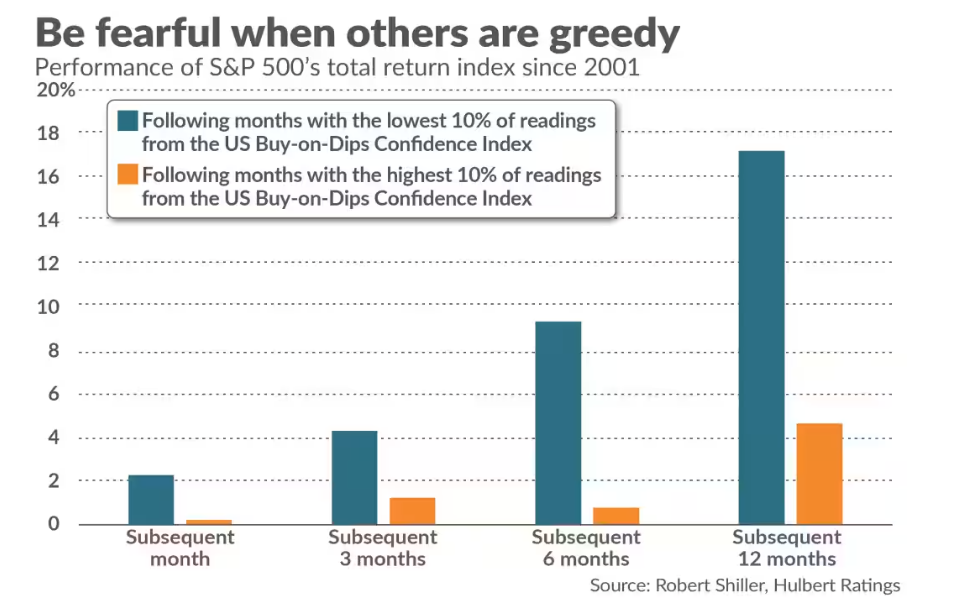 耶鲁大学金融学教授罗伯特·希勒(Robert Shiller)收集的数据印证了这一观点。自2001年起,他开始计算“逢跌买入信心指数”,该指数用于衡量“认为股市大幅下跌次日会反弹”的散户投资者比例。从附带图表可见,标普500指数在该指数处于高位后的表现,平均远差于指数低位后的表现。