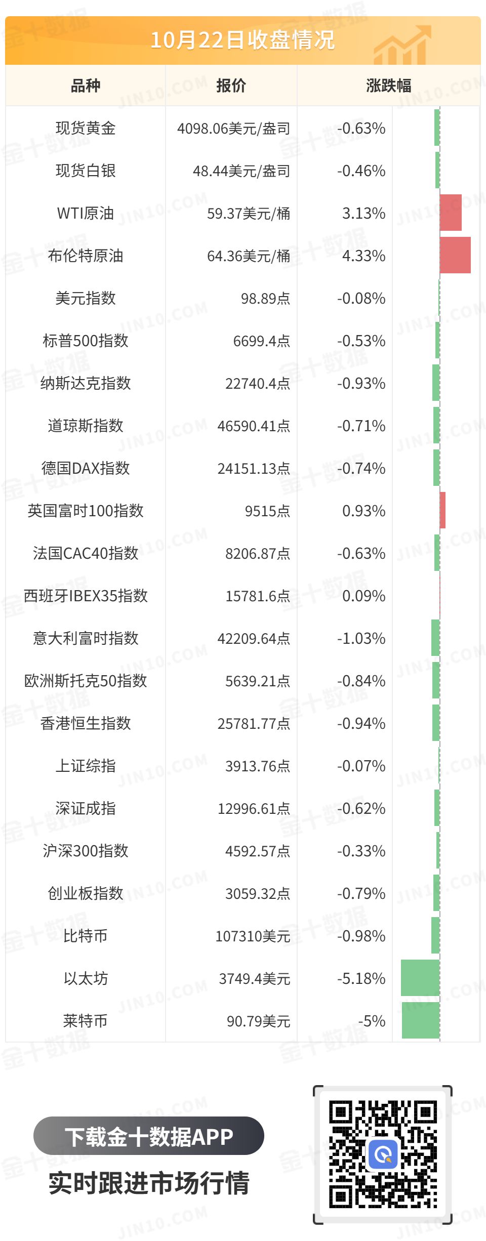 贝森特称将“大幅加码”对俄制裁,随后美国财政部宣布制裁两大俄油公司,国际油价大涨。WTI原油最终收涨3.13%,报59.37美元/桶;布伦特原油最终收涨4.33%,报64.36美元/桶。