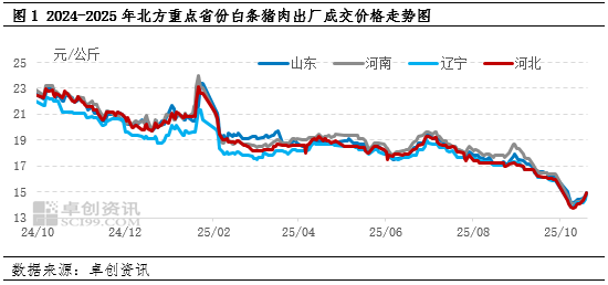 从图1看到,2025年10月份北方重点省份白条猪肉价格呈先跌后涨的走势。据卓创资讯统计,截至2025年10月22日,辽宁地区白条猪肉成交均价14.95元/公斤,较月内低点反弹7.94%;山东地区白条猪肉成交均价14.85元/公斤,较月内低点反弹4.58%;河南地区白条猪肉成交均价14.85元/公斤,较月内低点反弹5.69%;河北地区白条猪肉成交均价14.95元/公斤,较月内低点反弹9.12%。
