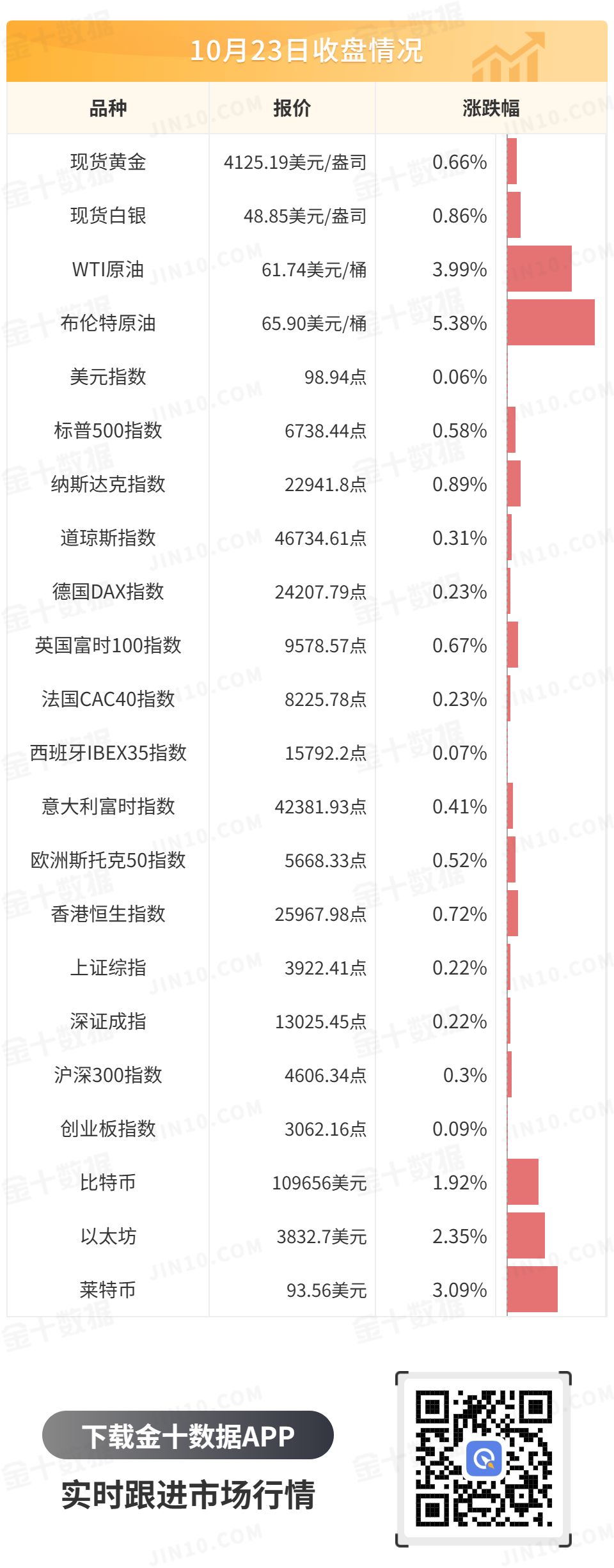 欧洲主要股指全线上涨,法国CAC40指数收涨0.23%;德国DAX30指数收涨0.23%;英国富时100指数收涨0.67%;欧洲斯托克50指数收涨0.52%。