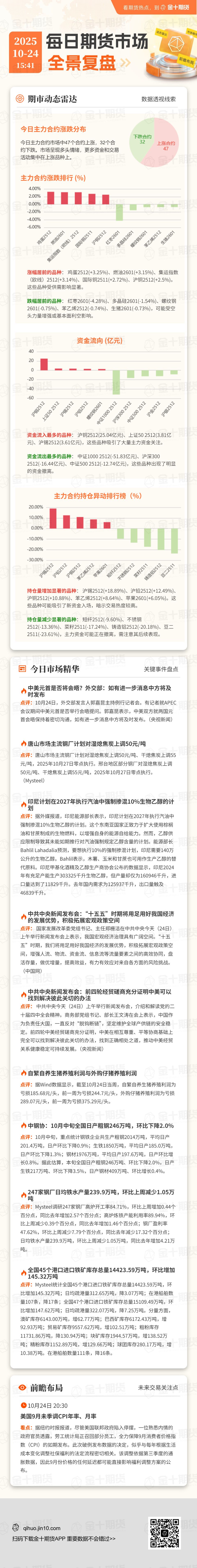 国投期货表示,原料端豆粕期货昨日减仓20万手,也呈现强势反弹状态。鸡蛋现货价格绝大部分地区上涨。 国庆节后蔬菜价格出现一波明显的上行。短期节奏上要注意风险的规避。中期我们认为行业后期仍需加快淘汰鸡来进行鸡产去产能去化。此外,冷库蛋尚未出库完毕,也是后期现货端潜在压力。盘面短期观望,中期恐仍有一轮跌势。