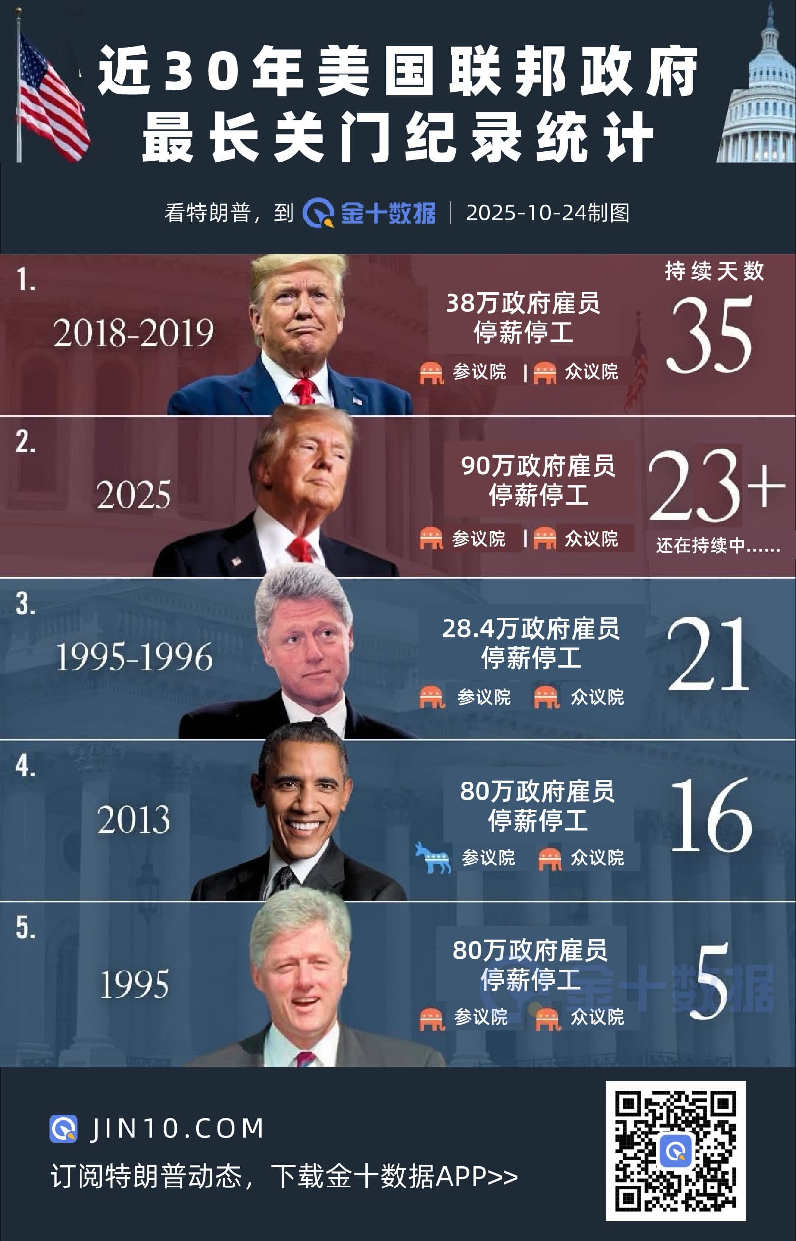 此轮美国政府停摆已经持续23天,时长排名第二,除了CPI延后发布外,其他大量经济数据也被迫“停摆”。