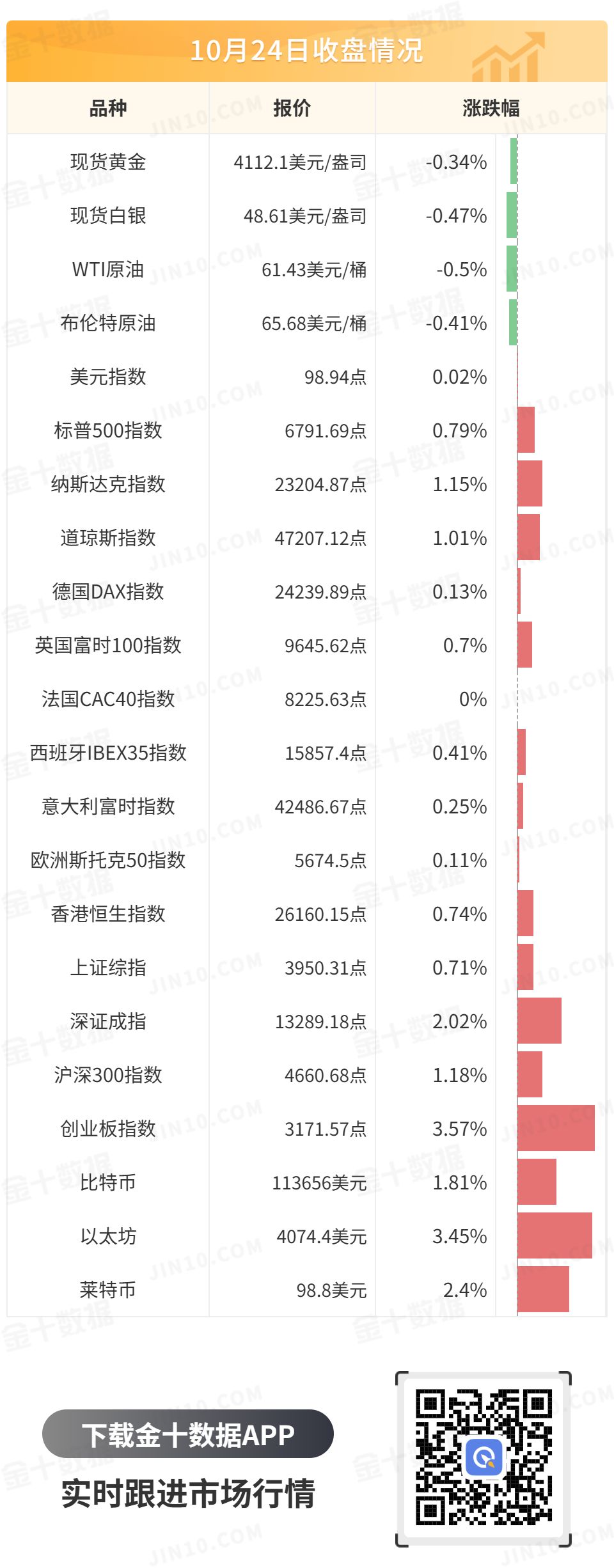 现货黄金全日震荡下行,在美国公布通胀数据后跌幅收窄,最终收跌0.34%,收报4112.1美元/盎司,录得十周以来首度周线收跌;现货白银最终收跌0.47%,报48.61美元/盎司。