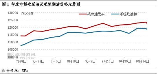 下半年以来印度国内豆油和棕榈油价格震荡走高。截至10月17日,印度毛豆油现货价格123600卢比/吨,较9月底提高1.64%;毛棕榈油现货价格119100卢比/吨,较10月初提高1.02%。因印度市场有强劲的食用油需求、当地价格持续上涨及阿根廷9月曾暂停豆油出口关税,造成印度9月大量进口豆油,创下三年多来新高。