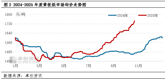 瓦楞及箱板纸主要生产原料以废黄板纸为主,配比可达85%以上。10月中上旬废黄板纸价格继续刷新年内高点,国庆期间北方降雨较多,废黄板纸回收及交投受阻,多地供应紧张,价格表现上涨。节后纸厂生产意向尚可,废黄板纸需求良好,市场呈现供不应求格局,价格继续上涨。据卓创资讯监测数据显示,截至10月24日,中国废黄板纸市场均价为1714元/吨,较9月末价格上涨51元/吨,涨幅为3.07%,成本面对于纸价支撑作用继续增强。