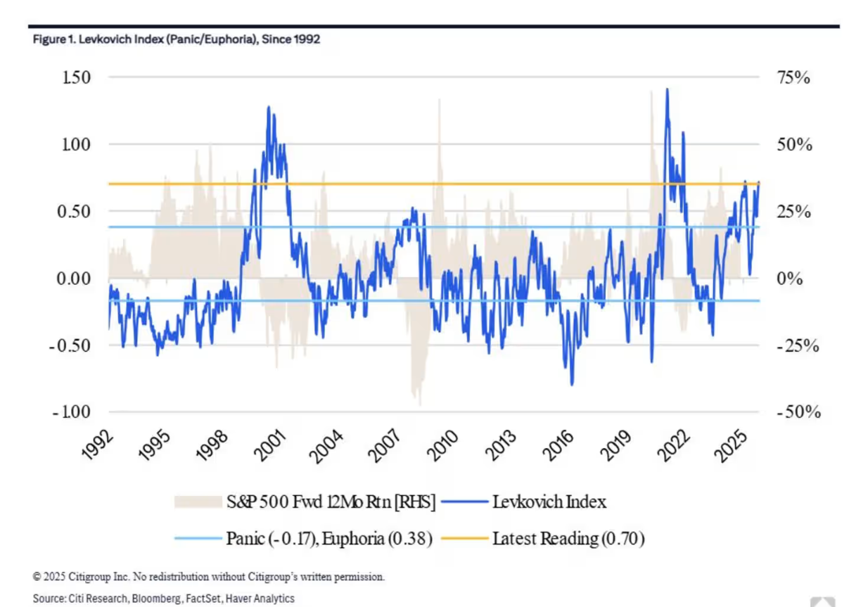 然而,他们发现投资者仍在投资组合中维持高比例的美国大盘股头寸,并且花旗集团的莱夫科维奇(Levkovich)股票市场情绪指数显示出“持仓狂热”。如图表所示,该指数目前处于除1999年科技泡沫和疫情后复苏交易时期之外的最高水平。