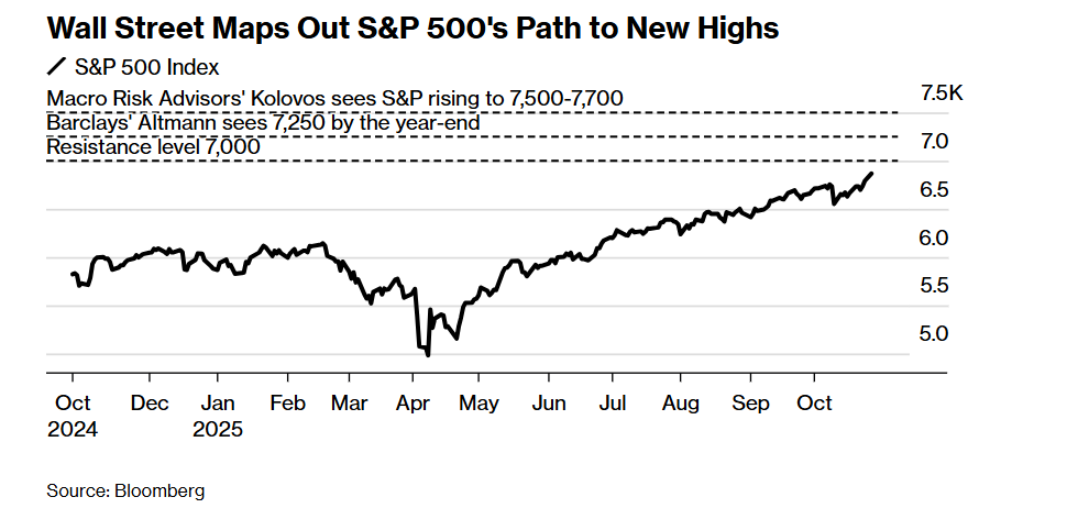 宏观风险顾问公司首席技术策略师约翰·科洛沃斯(John Kolovos)指出,标普500指数下一个阻力位就在7000点附近,仅比周一收盘价高出1.8%,突破后下一目标区间将指向7500-7700点。