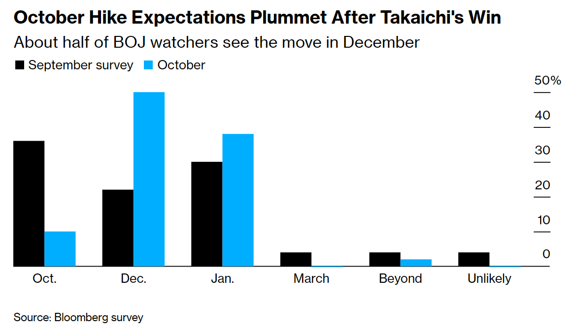 上个月的投票结果,以及一位被认为是鸽派的成员转向发出鹰派信号的举动,曾帮助推高了市场对10月加息的押注,在本月初的隔夜掉期市场定价中,这一概率一度升至约70%。随后,这一概率暴跌至约10%,主要原因是高市早苗的出现以及日本央行没有任何迹象表明可能在近期加息。