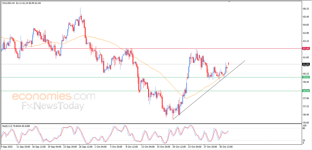 布伦特原油期货在上一个交易日上涨,相对强弱指标出现积极信号,尽管已达到超买水平,但在短期内仍处于看涨修正趋势的主导地位,且与趋势线并行交易,并在EMA50支撑位上方交易,进一步巩固了这一看涨走势,增加了短期内延续涨势的可能性。