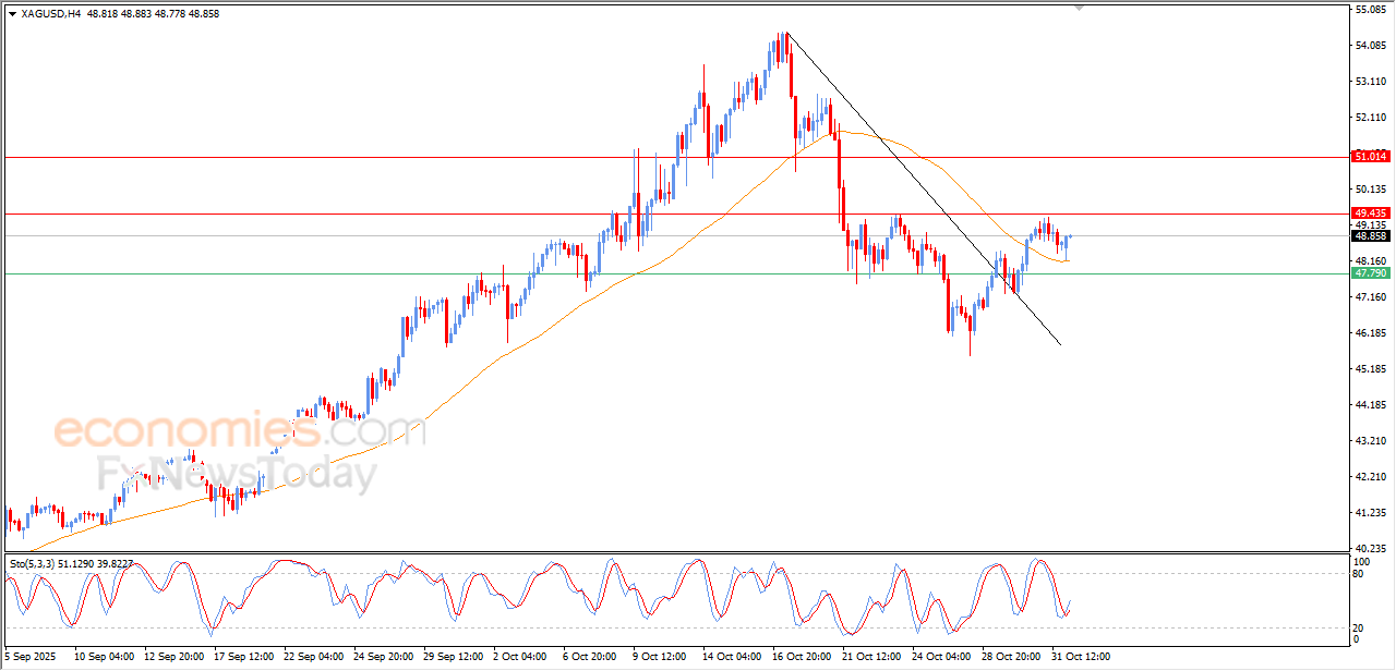 国际现货黄金上一个交易日内下跌,由于跌破EMA50指数,下行压力持续存在,短期内反弹的可能性降低,短期内看跌修正趋势占据主导地位,并持续推动交易走低。相对强弱指标在价格先前达到超买水平后持续发出负面信号,除非价格突破附近的阻力位,否则可能会进一步下跌。