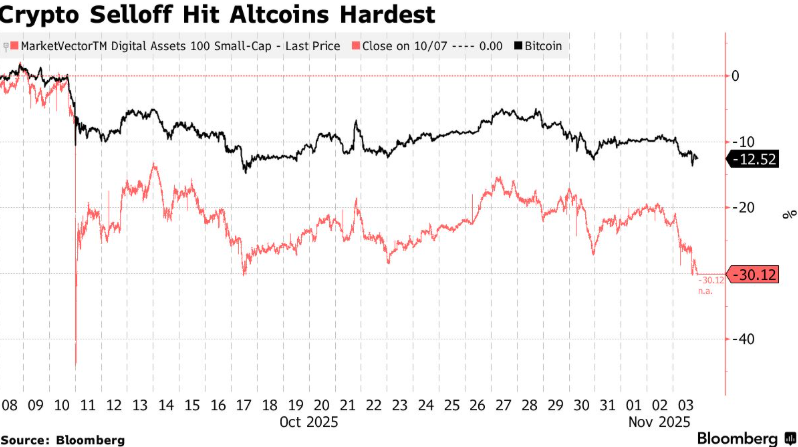 追踪前100大数字资产中排名后五十位表现的MarketVector指数连续第三个交易日下跌,跌幅深达8.8%,部分代币甚至重新下探至10月闪崩时的低点。该指数今年已下跌约60%。