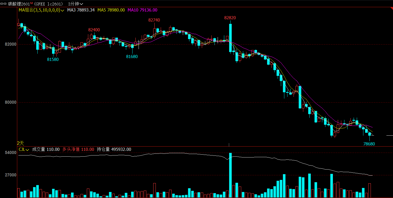 2025年11月4日周二,截止11时30分,碳酸锂主力合约报78860元/吨,跌幅3.97%,持仓量较上一交易日减少2.9万手,总持仓49.6万手,最近三个交易日累计跌幅6.63%。