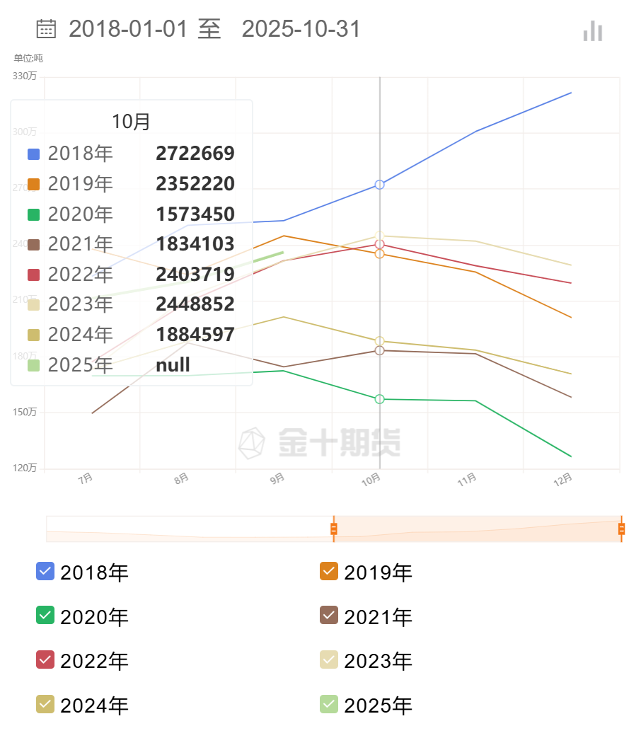 棕榈油方面,增产季尾声,MPOA预计马来西亚10月1-20日棕榈油环比增产10.77%,增幅较大,供应端压力使盘面承压。GAPKI预计印尼2025年棕榈油产量将增长10%,2024年印尼棕榈油产量5276万吨,即2025年预计增产超500万吨,远超年初预期的恢复性增产200万吨。印尼B50计划预计延迟,预期落空打压盘面价格。国内棕榈油11、12月买船持续增加,库存将小幅累库。整体来看,短期油脂弱势延续。