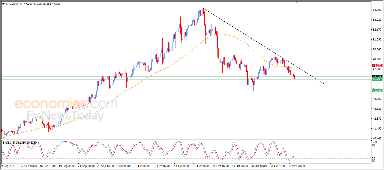 国际现货白银在上一个交易日下跌,触及46.80美元的当前支撑位。该支撑位是我们之前分析中预期的目标位。由于白银价格持续低于50日均线,下行压力持续存在,短期内看跌修正趋势的强度和稳定性得到加强。白银价格沿着趋势线运行,相对强弱指标出现负交叉,此前白银价格已跌破超卖水平,这为短期内进一步下跌打开了空间。