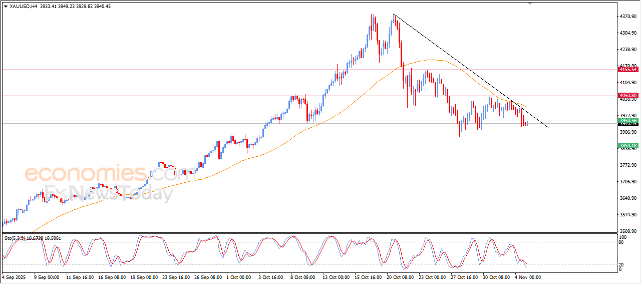 国际现货黄金上一个交易日内收低,跌破了3950美元的关键支撑位,该支撑位是我们之前分析中预期的目标位。与此同时,由于金价持续低于50日均线,下行压力持续存在,这进一步巩固了看跌修正趋势的稳定性,并且金价目前正沿着该走势的支撑趋势线交易。尽管相对强弱指标已达到超卖水平,但负面信号的出现表明多头动能疲软,并证实了当前交易中卖方力量的主导地位。
