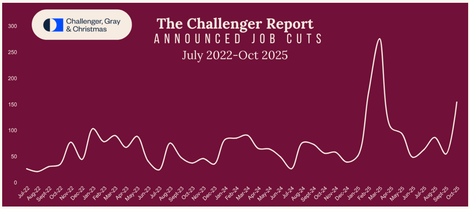“10月的裁员速度远超该月平均水平。部分行业在疫情期间的招聘热潮后正进行调整,但与此同时,人工智能的应用、消费与企业支出疲软以及成本上升,正推动企业收紧开支并冻结招聘。目前被裁员工更难快速找到新工作,这可能进一步松动劳动力市场,”挑战者集团职场专家、首席营收官Andy Challenger表示。