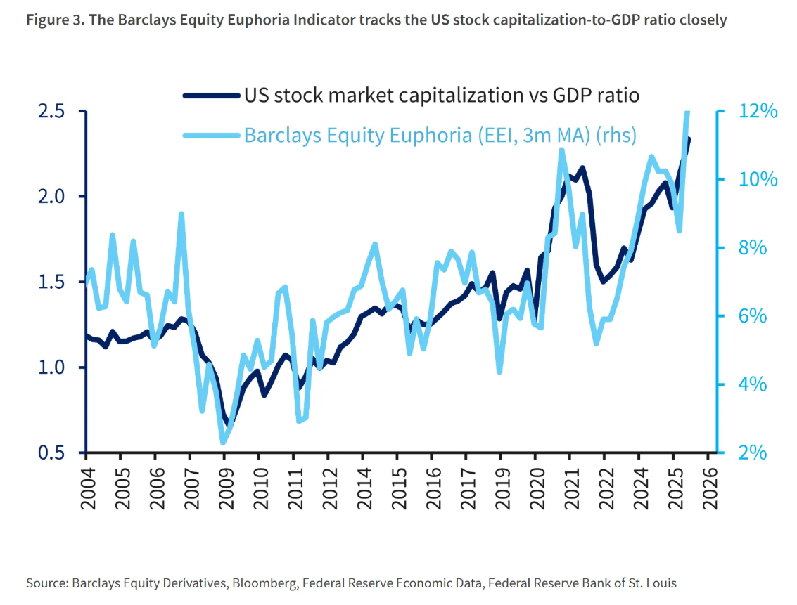 巴克莱衍生品策略师团队的Stefano Pascale在报告中直言不讳:“当前比率明确指向股票被高估,印证了市场对‘泡沫化行为’的担忧。” 他们强调,即使指标有其局限,投资者将这个创纪录的“市值/GDP”比率视为市场极度狂热的最新警钟,是明智之举。