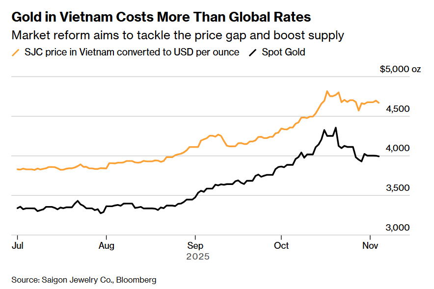 据该协会数据,越南每年黄金需求量约为55吨,是东南亚最高,但越南国家银行去年仅进口了约13.5吨。此次政策改革旨在缩小本土与全球金价的差距:目前越南黄金交易溢价通常在10%-15%,政府希望将其降至2%-3%。