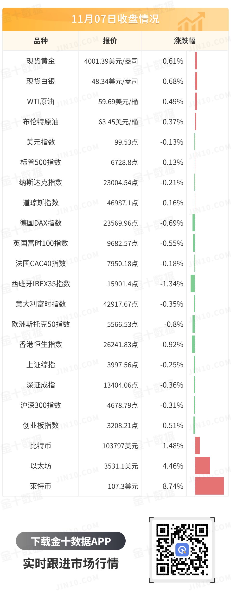 欧洲主要股指全线收跌,德国DAX30指数收跌0.69%;英国富时100指数收跌0.55%;欧洲斯托克50指数收跌0.8%。
