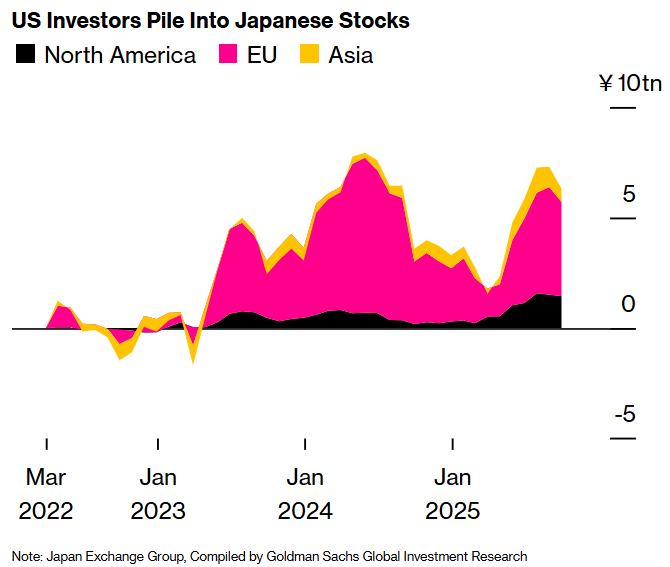 该行日本首席股票策略师布鲁斯·柯克(Bruce Kirk)指出:“美国资金流入增速已达到‘安倍经济学’时期以来的最高水平。”他表示美国投资者对日股的主动参与度已创下2022年10月以来新高,并透露自己频繁接到投资者的会议邀约。