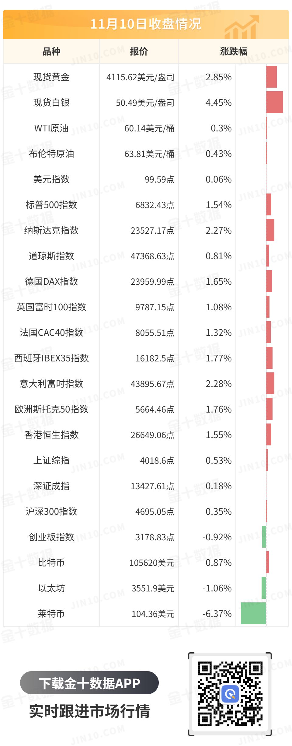 现货黄金大幅回升,日内大涨逾100美元,并重回4110美元上方,创下两周多以来的新高,最终收涨2.85%,收报4115.62美元/盎司;现货白银重回50美元关口上方,最终收涨4.45%,报50.49美元/盎司。