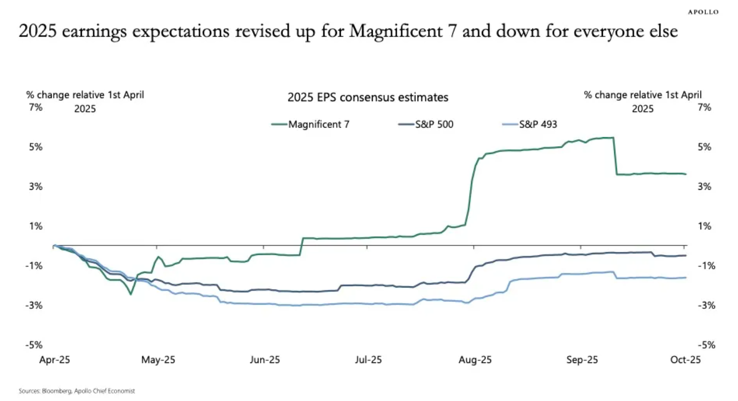 上周,该机构的首席经济学家托斯滕·斯洛克(Torsten Slok)发表了题为“企业K型经济”的报告,揭示了自2025年初以来,美股“七巨头”的盈利预期一路攀升,而标普493家“小弟”的盈利预期却在走下坡路。