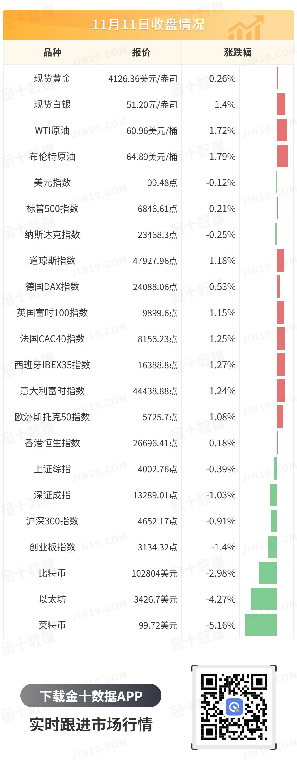 现货黄金盘中多次逼近4150美元关口,创近三周来的新高,但未能冲上此处,反而回吐部分涨幅,最终收涨0.26%,收报4126.36美元/盎司;现货白银稳站50美元关口上方,最终收涨1.4%,报51.20美元/盎司。