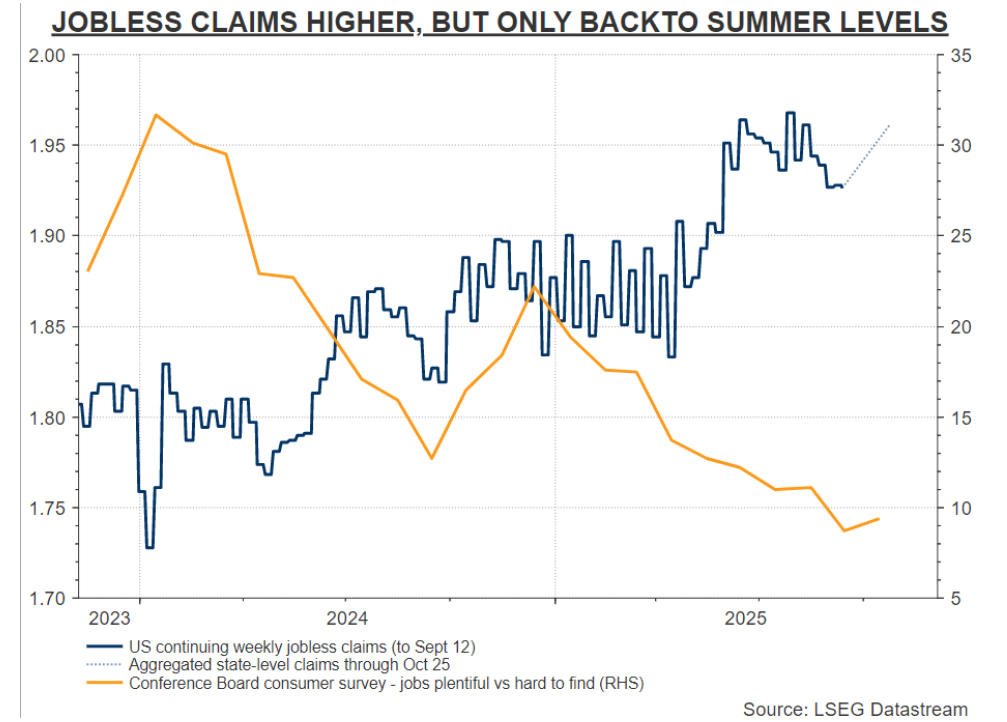 因此,除非即将发布的延迟数据出现重大意外,否则今年第三次降息的合理性正快速减弱。尽管期货市场仍定价12月再次降息的概率约为三分之二,但这很可能被证明过于乐观。