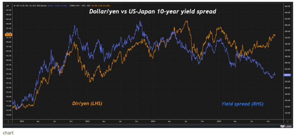 尽管如此,美元兑日元与美日债券收益率利差之间的紧密相关性已完全破裂,这表明日元可能处于异常疲软状态。瑞穗(Mizuho)分析师表示,当前利差对应的美元兑日元汇率应低于145。