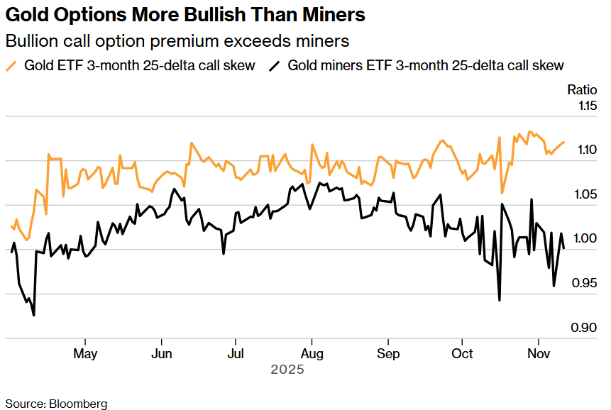 “如果你认为金价将上涨、金矿股将重拾领涨地位,而目前GDX的认购期权偏度低于2倍,那么这也是持有GDX的看涨期权或看涨期权价差以押注其持续上涨的理由。 ”他说。