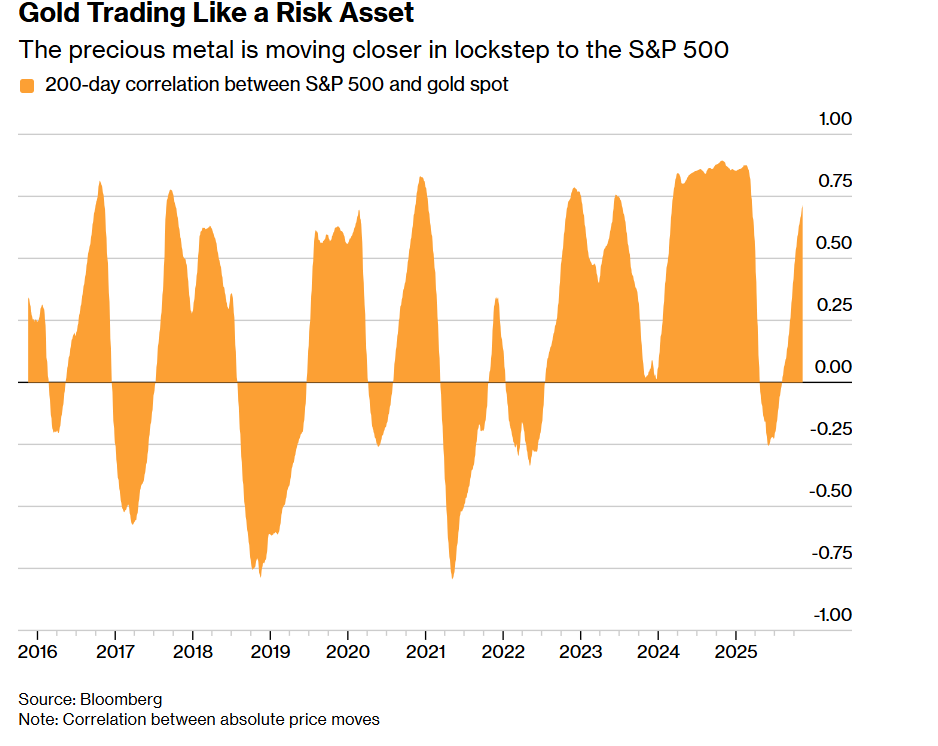 数十年来,黄金一直与股市呈反向走势,但在美元贬值担忧及各国央行对这一贵金属的旺盛需求推动下,黄金与股市的相关性已转为正向。