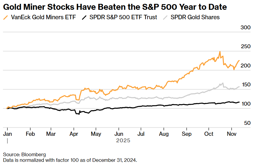 就个股而言,金矿企业纽蒙特公司(Newmont Corp.,代码NEM)、阿格尼科鹰矿业公司(Agnico Eagle Mines Ltd.,代码AEM)和巴里克黄金公司(Barrick Mining Corp.,GOLD)今年的涨幅均约为现货黄金的两倍。即便巴里克面临首席执行官离职、马里业务持续出现问题以及三季度营收不及预期等不利因素,仍未能阻挡投资者——该公司股价今年以来已上涨超130%。
