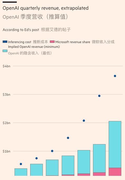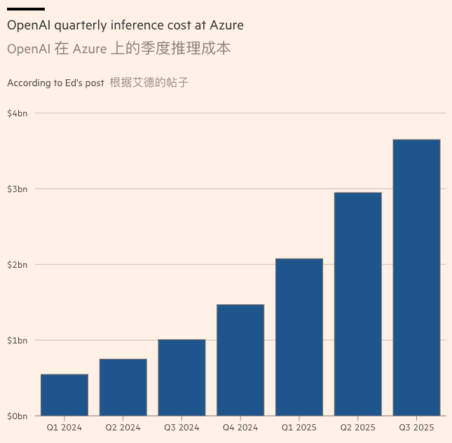 正如埃德所写,过去七个自然季度中,OpenAI仅在Azure上的推理计算支出就已超过124亿美元,而同期的最低营收估算仅为68亿美元。即便考虑到年度化速率与期末总额之间的误差,这种营收与运营成本之间的差距,仍远超此前外界报道。和埃德一样,《金融时报》也表示,很难解释这种差距为何如此之大。
