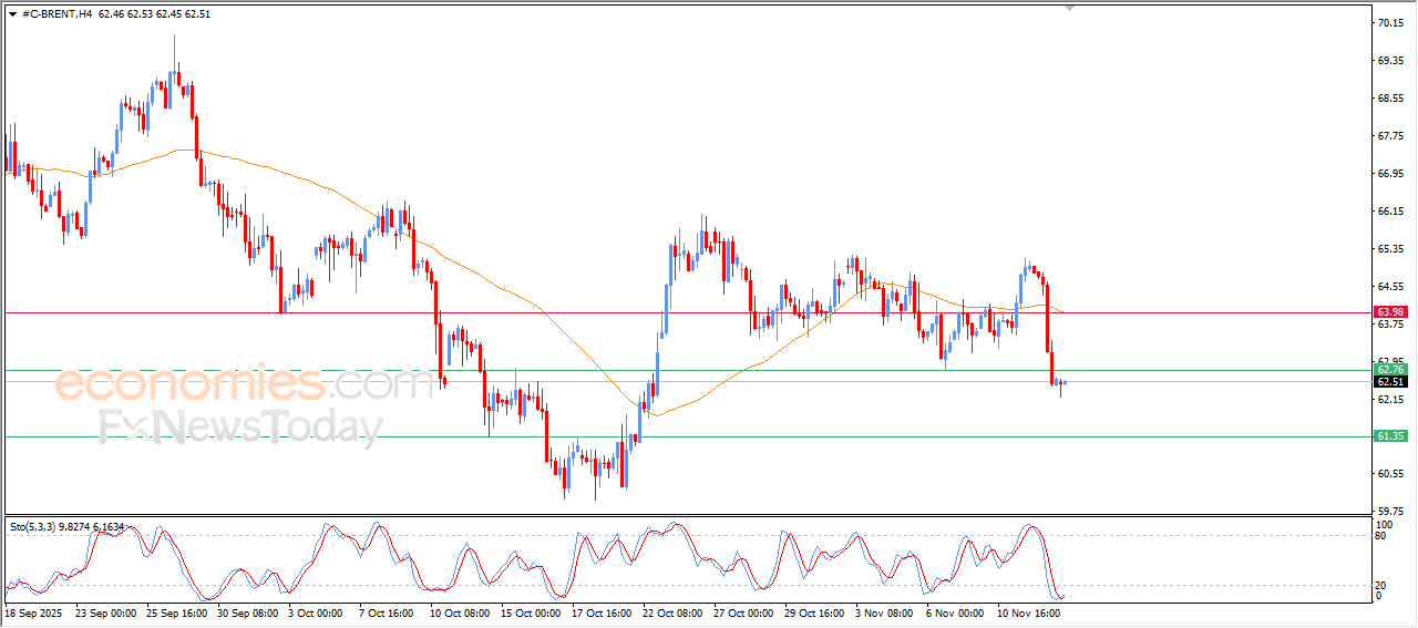 布伦特原油期货在最新的盘中交易中大幅收跌,主要受制于价格运行在EMA50均线下方所带来的负面压力,尽管短期内整体多头趋势依然占据主导地位。价格跌破关键支撑位62.75美元,进一步加剧了下行压力。另一方面,我们注意到在相对强弱指标上出现了积极的重叠信号,表明价格已进入超卖区间,这可能会在一定程度上缓解后续的跌幅。